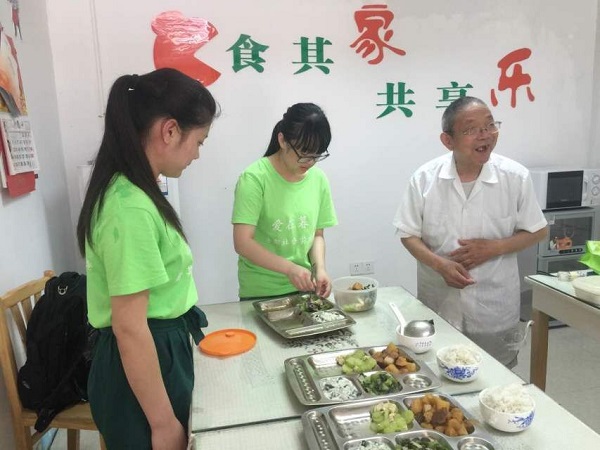 采购完食材,在餐厅值班的老党员杨奶奶热情地接待了大家,亲切地指导成员们分工进行洗菜、切菜、煮菜等一系列工作。公司团委书记魏琳老师也来到这里,一同参与团队的实践。最后,在杨奶奶的帮助下志愿者们一共煮了五道菜。烧完菜,成员们细心地将每一道菜装到盘中,等待前来就餐的老人。将近10点,老人们陆续来到餐厅领取午餐,杨奶奶告诉大家有一位90岁高龄的老夫妻因腿脚不便可能需要送饭,这时候,魏老师与同学们一起给老人送饭,同时也带去了祝福和关怀。