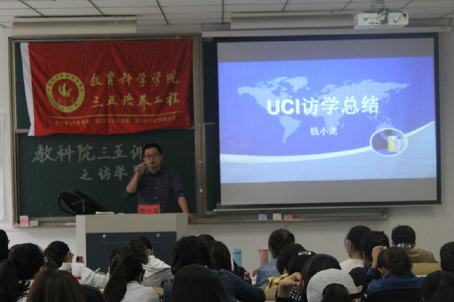 讲座开始,钱老师从UCI的教学地位出发,与同学们分享了留学的条件和所需的准备。之后,钱老师用丰富的图片描述了加州的校园环境、气候条件及公共设施等,并结合他在访学期间的美国课堂见闻,从教育设备和教育形式的两个角度反思了美国教育和中国教育的不同,详细地讲解了美国当下传统与现代相结合的教学设备和自由而不失严格的教育形式,并提出“传统媒体不等于是没有价值的”。接着,钱老师结合个人经历,以举例的形式阐述了美国师生、同学、以及当地华侨和职工之间和谐的人际关系,并穿插讲述了当地起居、饮食习惯等文化。最后,钱老师向在座的同学展示了自己在访学期间取得的学术成果,也同时表达了自己在美国时思念家乡的感情。