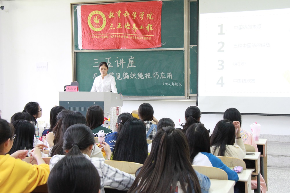 5月9日14:00,威廉希尔于8号教学楼102教室成功举办了三五讲座之“几种常用的编织绳技巧”。本次讲座由民间艺人赵敬波老师主讲,教科院100余名员工到场参与此次讲座。