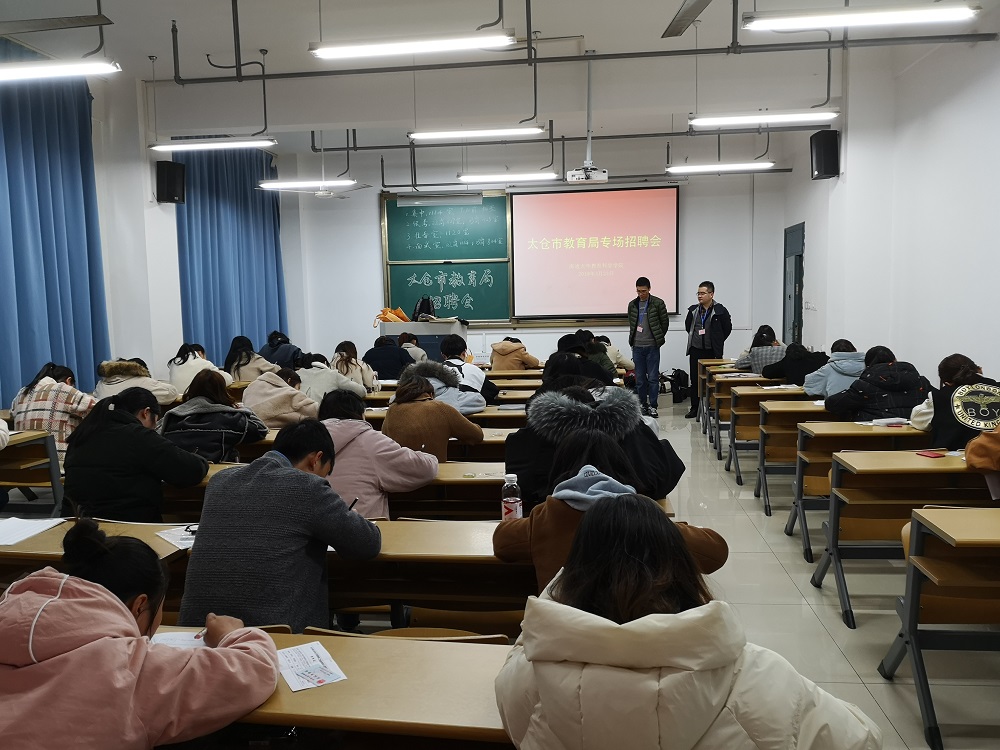 2019年3月23-24日,williamhill在18号教学楼1112等教室举办太仓市教育局专场招聘会,太仓市教育局副局长张跃忠率队前来,公司党委副书记徐红波进行了接待并考察招聘会现场,来自院、williamhill威廉希尔、江苏师范大学等公司的同学进行了为期两天的招聘考试。