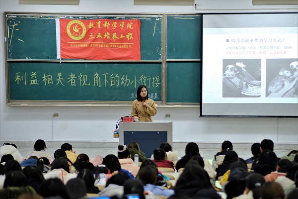 此次讲座,杨晨晨老师首先例举了学前班教学内容大多超出幼儿认知范围的社会现状,引出了关于幼小衔接的问题。老师分析了幼小衔接这一过程的各个受益者,他们深知家长不希望孩子输在起跑线上的心理,因此幼儿园为了招生实施小学化教育,各种私人教育机构设置各种早教班,从中获利。而在这个过程中我们往往忽略掉的是最不该忽略的“受益者”儿童的感受。杨晨晨老师表示:“你怎么对待孩子,孩子将来就会成为什么样的人。孩子最初的学习主要是通过感知觉和运动觉,如果限制了孩子的活动,强迫他们靠死记硬背来学习的话,孩子未来的学习方法可能就不会变通,孩子将会失去很多能力。孩子的大脑接收到了超出孩子承受范围的刺激,这往往会对孩子大脑的某些区域的发育产生影响。”在这之后杨晨晨老师展示了几个心理学的案例,进一步证明了孩子应当在适宜的时间接受适宜的刺激,这样才能对他们的成长产生帮助。