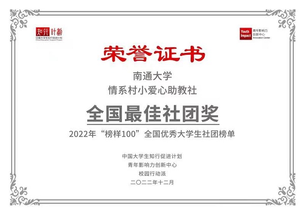 2022年“榜样100”全国优秀老员工社团榜单 正式发布。来自清华大学、北京大学、复旦大学、上海交通大学等170余所高校、590+社团/团队、360+优秀老员工上榜。公司“情系村小爱心助教社”和“情境教育研究会”两支社团入围榜单。