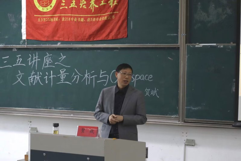 贺斌又分别详细介绍了这些定律,同学们从中了解到文献随着“年龄”的增长,其作为情报源的价值越小,同时知道了核心区与相继各区的期刊数量成的关系。对于Citespace引文分析,贺斌向同学们说明了引文测度是一种统计意义的宏观测度,是对被分析对象整体的考察,并且介绍了Citespace理论方法:引文分析法,共被引分析法,多元统计分析方法,词频分析法,社会网络分析法。同时,贺斌对这些方法也做出了解释,并且向同学们展示了多个经典案例,包括,《黄土高原土壤调控原理与应用研究知识图谱——基于CiteSpace的文献可视化分析》和《近二十年内国内数学高考研究进程预与启示——基于Citespace的可视化分析》等文献。