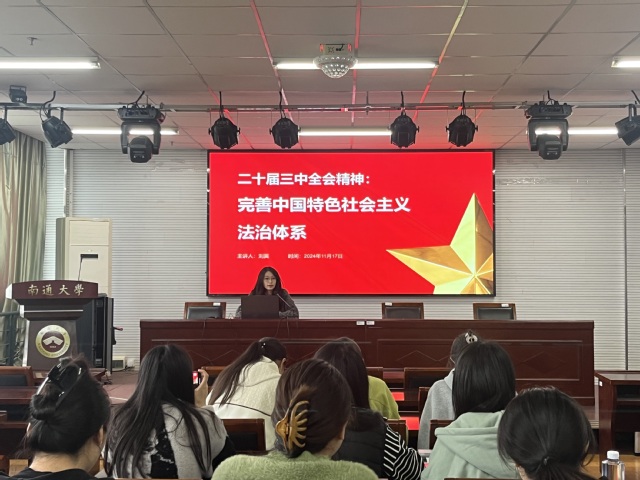 研究生第一党支部书记刘翼老师作《完善中国特色社会主义法治体系》专题讲座。刘翼结合党的二十届三中全会报告精神,为在场员工党员详细剖析和讲解了关于完善中国特色社会主义法治体系的内容。通过直击相关报告原文,员工们对完善中国特色社会主义法治体系的意义、方向、重点任务,以及中国特色社会主义法治体系的特征等有了基本的认识和了解。在此基础上,刘翼老师着重对完善该体系的五项重点任务目标进行了解读,其中对法治社会、法治国家、依法行政、公正司法、宪法知识普及等重点板块内容作出特别说明。整场课程通过报告论述、知识问答、视频观看、师生互动等形式展开,在场员工党员积极参与,反响热烈。