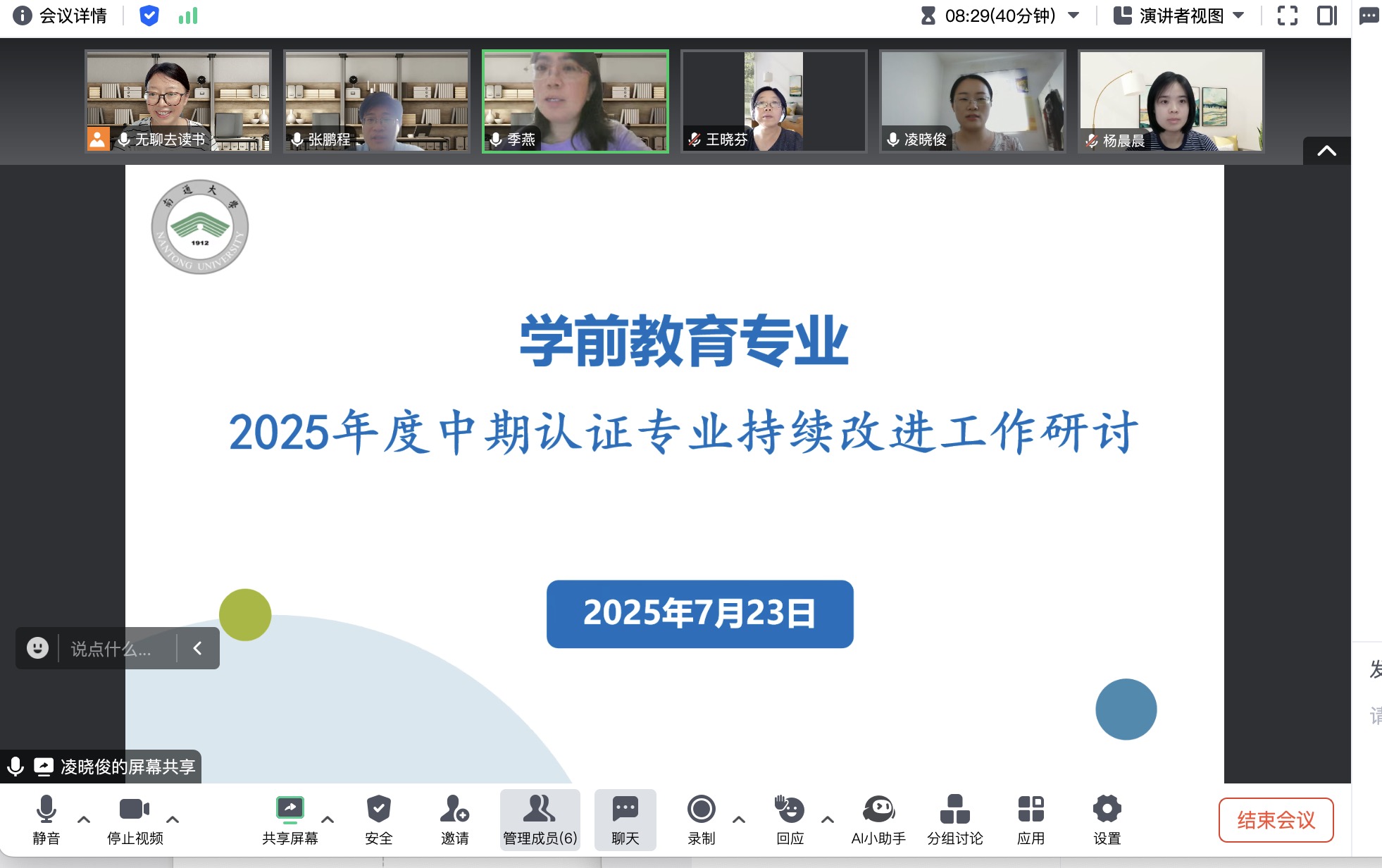 7月23日,公司召开学前教育专业认证第二级中期持续改进及新一轮专业认证工作研讨会。williamhill教学经理张鹏程教授、学前专业学科带头人王晓芬教授、学前专业负责人钱慧教授、系支部书记季燕副教授、学前系主任凌晓俊、副主任杨晨晨等人员出席此次线上会议。会议围绕两大议题展开:一是学前教育专业认证第二级终期总结工作,二是部署新一轮专业认证筹备工作。